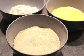 Prendre 3 assiettes creuses. Dans assiette 1) Etaler la farine. Assiette 2) battre les oeufs en omelette + sel + poivre + 2 cuillères à soupe d’eau ( « faire une anglaise ». Assiette 3) mélanger chapelure + Parmesan.