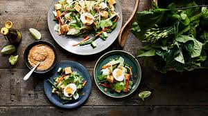 Sur un plat ou 4 assiettes de service, disposer joliment légumes: cou + haricots verts + pousses de soja + pommes de terre + concombre + oeufs durs.