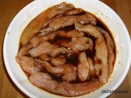 Marinade: – Détailler le blanc de poulet en lanières. Les mettre dans un saladier.