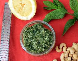 Faire le pesto sucré: – Dans un pilon, bien écraser pignons + feuilles de menthe. Incorporer peu à peu en filet ( comme pour monter une mayonnaise !) jus de citron + huile d’olive sans cesser de tourner toujours à la même vitesse et dans le même sens. En dernier, ajouter le sucre en poudre et bien mélanger. Entreposer au frigo.