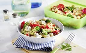 Dans un saladier, mélanger délicatement tous les ingrédients: mesclun + brocolis & boulghour + tomates + concombre + Feta + coriandre + olives. Poivrer.