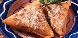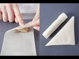Découper les feuilles de bricks en larges bandes. Déposer 1 cuillère à soupe de préparation aux dattes au bas de la feuille de brick. Replier à peu près le 1/3 de la feuille de manière à recouvrir la farce puis replier le triangle obtenu dans un second 1/3 de feuille en rentrant un peu les bords vers l’intérieur – enfin faire un dernier tour de ce petit paquet pour enrober la farce dans toute la feuille ( » plier en samossa »). …. faire ainsi jusqu’à « épuisement des ingrédients, feuilles de bricks et farce.