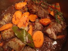 Saupoudrer de farine et mélanger 2 mn pour faire « cuire » un peu la farine. Verser le vin rouge. Ajouter laurier + thym. Saler, poivrer. Mélanger 2 mn.