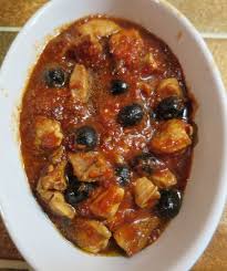 Ajouter laurier + tomates concassées + concentré de tomate + sel + poivre + laurier + olives. Porter à ébullition en remuant le tout plusieurs fois. Mettre un couvercle. Baisser le feu. Laisser doucement mijoter 50 mn.
