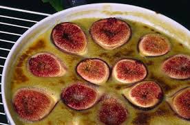 Incorporer le lait chaud tout en touillant vivement + crème fraîche + semoule. Bien mélanger. Recouvrir les 1/2 figues de cette préparation.