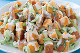 Egoutter les patates douces cuites. Les découper en dés. Les mettre dans un saladier + tous les autres légumes et ingrédients. Bien mélanger et laisser macérer 1 heure minimum dans un endroit frais.
