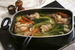 Dans un faitout, mettre poitrine de porc + oignon + pois chiches + laurier + thym. Porter à ébullition. Couvrir. Laisser cuire 1 h 30 mn à petit frémissement.