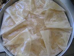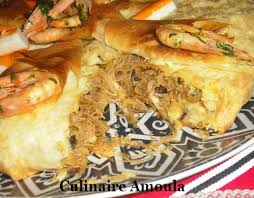 Prendre un moule à manqué. Disposer 4 feuilles de brick en les faisant se chevaucher et déborder du moule. Etaler dessus les oeufs brouillés aux oignons & amandes. Recouvrir de 4 feuilles de bricks se chevauchant. Les badigeonner largement de beurre fondu. Recouvrir en les alternant de moules + crevettes + crabe. Couvrir entièrement des 4 dernières feuilles de brick se chevauchant. Badigeonner du reste de beurre fondu.