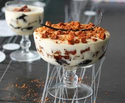 Passer 1/3 des dés grillés de pain d’épices dans le sirop recueilli sous les pruneaux ( retirer la gousse de vanille !). Les répartir dans les coupes. Recouvrir d’1 couche de crème au Mascarpone ( en utilisant la moitié de la crème). Parsemer d’ 1 second 1/3 de dés de pain d’épices trempés au préalable dans le sirop. Répartir les pruneaux par dessus. Napper du reste de crème. Terminer avec le reste des dés de pain d’épices trempés dans le sirop. Décorer avec 1 pruneau chaque coupe.