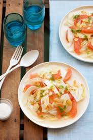 Répartir sur les assiettes ou dans des coupes, en les alternant, tranches de pamplemousse + fenouil. Parsemer d’amandes effilées. Arroser de vinaigrette au miel et pamplemousse.
