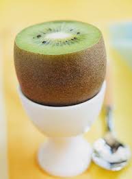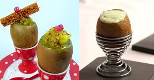 Disposer les kiwis dans 4 coquetiers. Entreposer au frigo jusqu’au moment de servir avec les mouillettes en gâteaux ou bonbons plantés dedans.