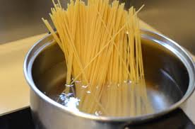 Porter de l’eau bouillante salée à ébullition. Y plonger les spaghetti pour le temps indiqué sur le paquet, qu’ils restent » al dente ». Les égoutter et les mettre dans le plat de service.
