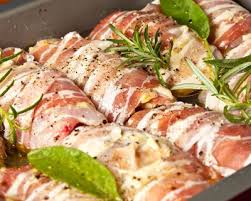 Etaler sur la planche de travail les tranches de lard. Y répartir les foies de volaille. Rouler les foies dans le lard en les entourant bien. Fixer la roulade avec 1 ou 2 pics en bois.