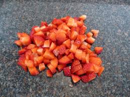 Rincer et sécher les fraises. Les équeuter. Les couper en dés.