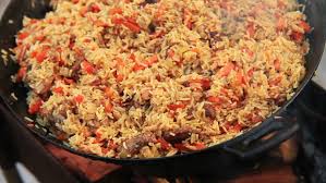 Incorporer poivre + safran + paprika + cumin. Porter à ébullition et aussitôt, étaler le riz égoutté sur toute la préparation. Ne pas mélanger. Couvrir la cocotte. Laisser doucement mijoter 30 mn ( ajouter éventuellement 2 à 3 cuillères à soupe d’eau si le riz n’est pas tout à fait cuit).