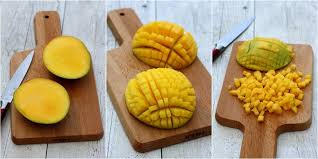 Peler avocats + mangues et ôter les noyaux. Les détailler en mini dés.