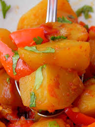 Ajouter lanières de piment égouttées + dés de pommes de terre + coriandre. Mélanger 3 à 4 mn pour bien enrober les pommes de terre des épices et ôter du feu.