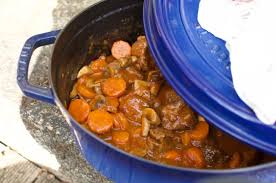 Ajouter oignons + carottes + bouquet garni. Verser le cidre. Saler, poivrer. Mélanger. Couvrir la cocotte. Baisser sur feu doux pour 2h à 2 h 30 de cuisson.