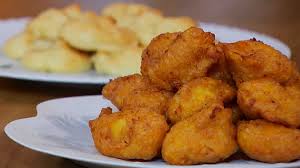 Pâte à beignets: – Dans un saladier, bien mélanger farine + levure + 2 cuillères à café de fécule + 1 cuillère à café d’huile de sésame + 1 cuillère à café d’huile d’arachide + sel.