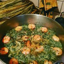 Dans une cocotte, chauffer l’huile. Mettre épinards + crevettes + oignons + pâte d’arachide + piment + sel + poivre. Bien mélanger. Couvrir. Laisser doucement mijoter 1 h 30 à 2 heures.