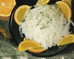 Dans un bol, fouetter jus de citron + eau de fleur d’oranger + sel. En arroser les radis râpés. Bien mélanger.
