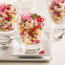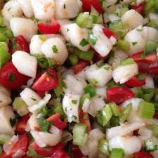 Egoutter pétoncles et crevettes de leur marinade. Les remettre dans le saladier + tomate + oignon rouge + petits oignons nouveaux + ail + coriandre + piment + sel. Bien mélanger.