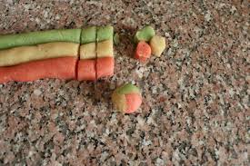 Prendre de la pâte d’amande de 3 couleurs différentes.