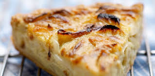 Parsemer le fond de tarte précuit avec la moitié de l’Emmenthal + la moitié du Gruyère. Etaler dessus l’ oignon. Mettre le reste de fromages sur l’oignon.
