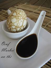 Pendant ce temps dans une autre casserole, porter à petit frémissement 50 cl ( 1/2 litre) d’eau + sel + poivre + sauce de soja claire + sauce de soja foncée + le thé + 5 épices…… . Y plonger les oeufs et laisser 10 mn à petit frémissement…. Oter du feu.