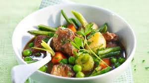 Ajouter céleri + chou-fleur + haricots verts + petits pois + pommes de terre + carottes. Faire revenir 3 à 4 mn puis arroser de bouillon. Porter à ébullition puis couvrir. Baisser à feu doux et laisser mijoter 25 mn.