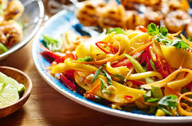 Mettre la mangue dans un saladier. Ajouter le porc + le contenu de la poêle sorti à l’écumoire. Mélanger.
