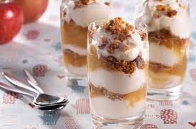 Prendre des grands verres. Alterner 1 couche de compote + 1 couche de chapelure + 1 couche de crème fouettée … et recommencer 1 couche de pomme etc … jusqu’à épuisement des ingrédients en terminant par de la crème fouettée.
