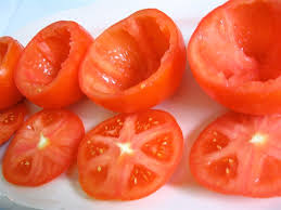 Découper un chapeau aux tomates. Les creuser sans entamer la peau. Hacher la pulpe récupérée.