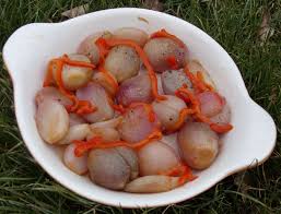 Facultatif: Vous pourrez rajouter des petits oignons grelots ou 1/2 poivron vert + 1/2 poivron rouge: 1/2 émincés en fines lanières et ébouillantés 3 mn puis égouttés et épongés sur du papier absorbant.