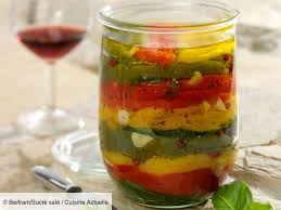 Remplir les bocaux avec les poivrons joliment rangés et arrosés de leur jus de cuisson ( ils doivent être recouverts )……. Fermer hermétiquement le ou les bocaux.——-Chaque jour, pendant 3 jours, couler le jus de cuisson dans une casserole et lui donner un bouillon .. puis le re-verser dans le ou les bocaux.