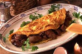 Dans une autre poêle, chauffer le reste d’huile sur feu assez vif. Y faire sauter les foies 3 à 4 mn….. Les sortir à l’écumoire … – Nettoyer la poêle….. La remettre sur le feu et y fondre le beurre… Couler les oeufs battus et faire cuire l’omelette + ou – selon votre goût ( 4 à 6 mn).