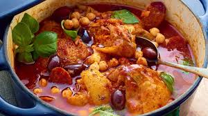 Remettre le poulet dans la cocotte + les pois chiches. Mélanger. Couvrir. Laisser doucement mijoter 1 bonne heure.