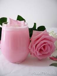 Dans une carafe, bien mélanger 3 à 4 mn, en fouettant, yaourts + lait + eau de rose + sucre ( + colorant rouge).