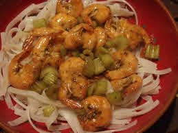 Dans une sauteuse ou poêle, chauffer le reste de beurre …. Y faire revenir 5 mn le céleri râpé …….. ajouter gambas + tomates + sel + poivre. Faire revenir doucement 7 à 8 mn …. .