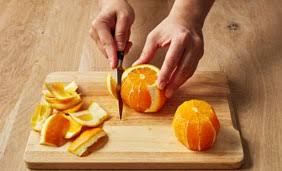 Peler les oranges à vif ( = retirer l’écorce = le zeste + la membrane blanche = le ziste)……….. Emincer les oranges en fines rondelles et les disposer en couronnes sur un plat, des assiettes individuelles ou dans des bols.