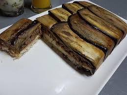 Prendre un moule genre moule à manqué. Y étaler 1/3 des lamelles d’aubergines … puis 1/3 du hachis de viande … puis 1/3 du riz cuit … puis 1/3 du fromage râpé et recommencer les couches avec 1/3 d’aubergines + 1/3 de hachis …….. etc …. jusqu’à épuisement des ingrédients et en terminant par du fromage râpé.