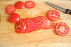 Emincer finement les tomates … Les mettre dans un saladier + les petits oignons + la coriandre + le contenu du verre.. Bien mélanger …. Placer 15 mn au frigo avant de servir frais ( mais pas trop froid !).