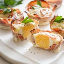 Servir rapidement, pour qu’ils restent chauds, les oeufs frits entourés de bacon + pruneaux.