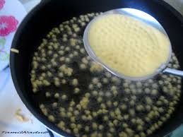 Faire chauffer de l’eau dans une grande casserole puis l’ôter du feu. Plonger les bondies pour 3 à 4 mn, qu’ils ramollissent ………… Presser sur chaque boondi pour extraire son eau et les déposer au fur et à mesure sur du papier absorbant 2 mn.
