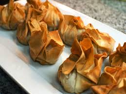 Humidifier légèrement le pourtour de chaque carré … Refermer chaque carré en repliant les pointes vers le centre pour obtenir de petits aumônières. Bien appuyer pour sceller les petits paquets…………….Placer 10 mn au frigo.