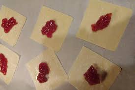 Disposer les carrés de pâte devant vous. Les poudrer de farine de maïs. Déposer 1 cuillère à café de fruits au centre de chaque carré….