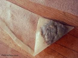 Sur chaque bandelette, déposer dans un coin 1 grosse cuillère à café de farce à la betterave …. Plier en coin farci en un triangle .. puis continuer par des triangles de même taille à plier la bandelette de pâte jusqu’au bout…..———- Recommencer de même pour chaque bandelette.