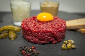Dans un saladier, bien mélanger steak haché + jaune d’oeuf + oignon + échalotes + fines herbes + câpres + cornichons + moutarde + huile d’olive + jus de citron + Tabasco + Worcester + sel + poivre.