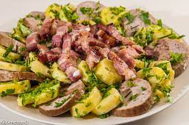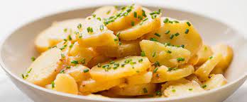 Egoutter les pommes de terre. Les peler. Les couper en tranches minces……. Les mettre dans un saladier. Les arroser de vin blanc encore chaudes.