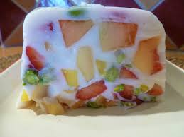 Au bout de ce temps, sortir le moule: la gelée d’amande doit être prise. La découper en petits carrés ou losanges que vous incorporez dans la salade de fruits.
